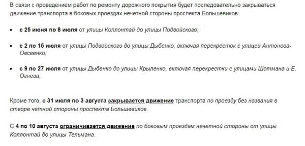 квадратных метров проезжей части).Автолюбителям сообщают, что из-за ремонта последовательно закроют движение транспорта в боковых проездах нечетной стороны проспекта Большевиков: